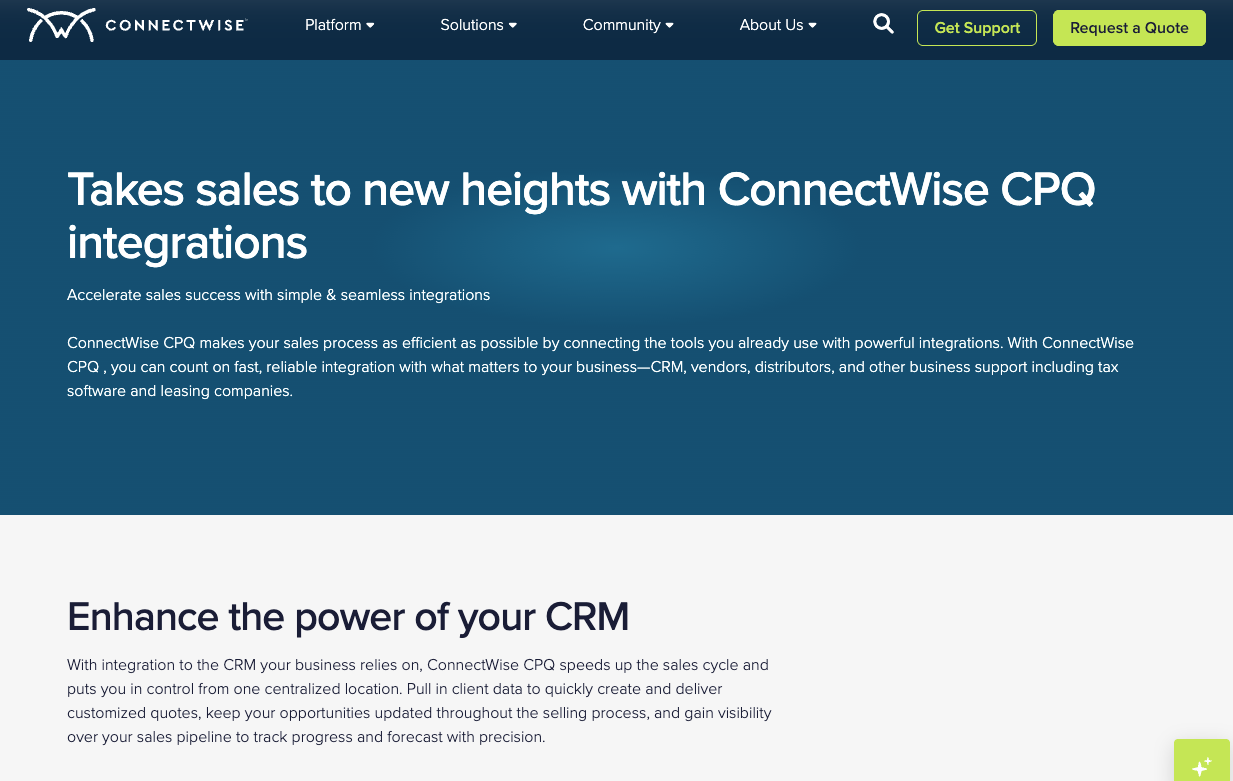 ConnectWise CPQ integrates with several CRM platforms, most notably Salesforce, which is its most robust CRM integration outside the ConnectWise ecosystem. Through this connection, teams can pull customer records directly into quotes, update opportunity stages automatically, and maintain a real-time view of pipeline progress without switching between systems.