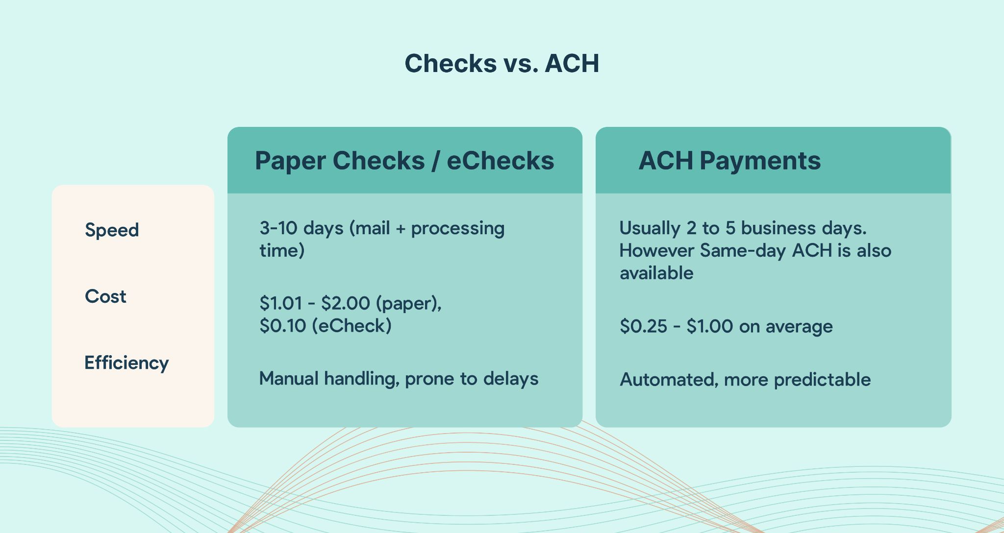 - Faster settlement: Standard ACH payments often clear in 3-5 business days; same-day ACH speeds this up further. Compared to checks that may take a week or more to clear (when mailing, processing, clearing are factored in), the difference is dramatic.