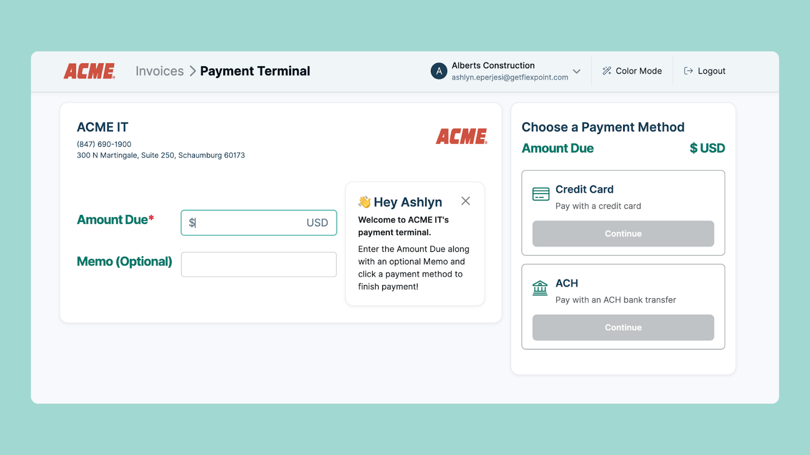 This link directs your customer to a secure, hosted FlexPoint payment page where they can choose ACH, credit card, or financing if over $10k.